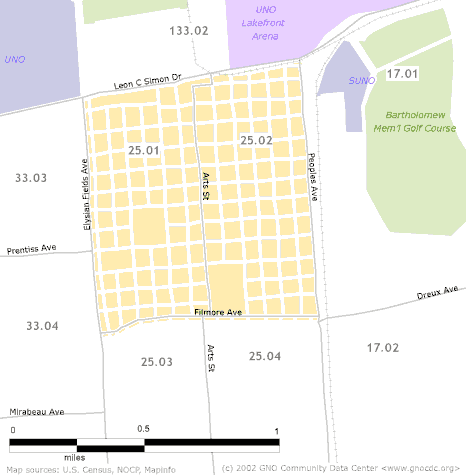 Maps of the Milneburg NeighborhoodNeighborhoods in the Data Center web site are made up of Census tracts. This allows the easy combination of Census data to give accurate information at the neighborhood level. Below you'll find three maps. The first of these shows Census tract boundaries, the second is a street map with the neighborhood boundaries, and the third, just for comparison, shows the zip code boundaries that fall in this neighborhood. Census tract boundaries![]() Street map boundaries![]() Zip code boundaries![]()