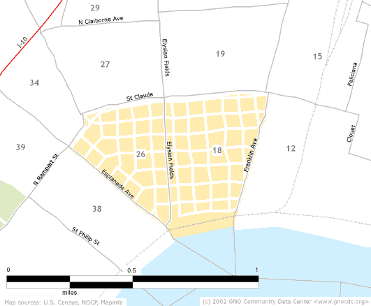 Maps of the Marigny NeighborhoodNeighborhoods in the Data Center web site are made up of Census tracts. This allows the easy combination of Census data to give accurate information at the neighborhood level. Below you'll find three maps. The first of these shows Census tract boundaries, the second is a street map with the neighborhood boundaries, and the third, just for comparison, shows the zip code boundaries that fall in this neighborhood. Census tract boundaries![]() Street map boundaries![]() Zip code boundaries![]()