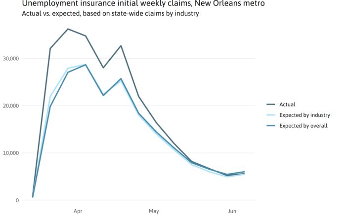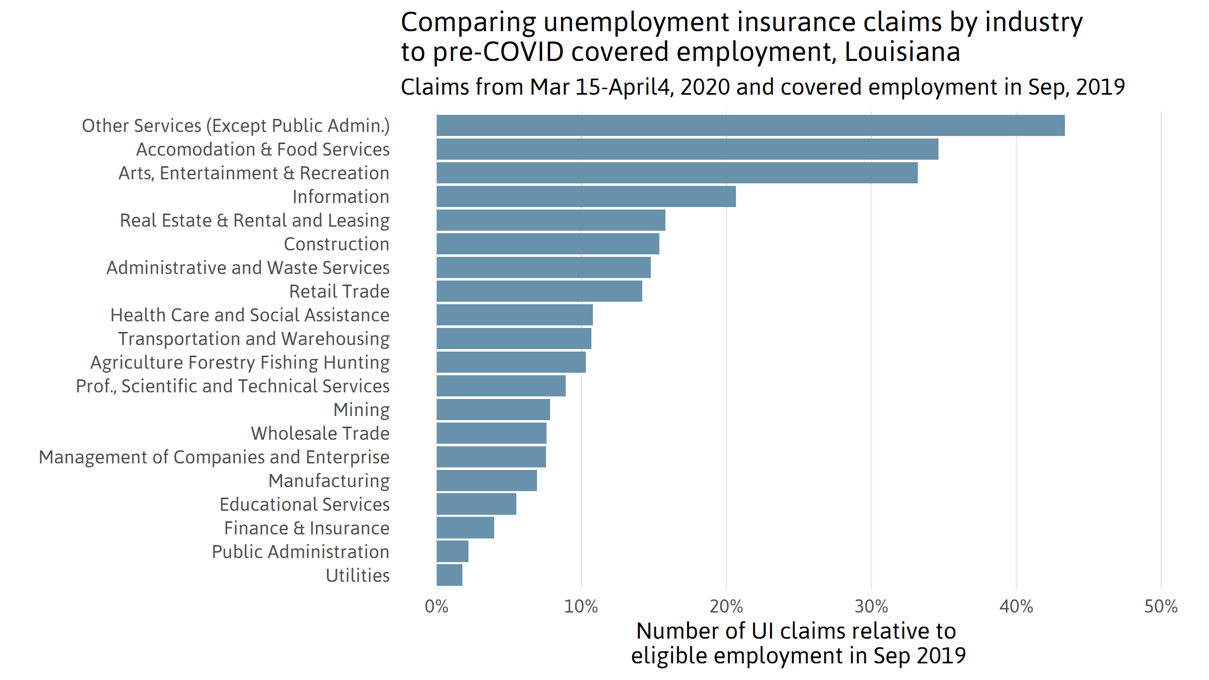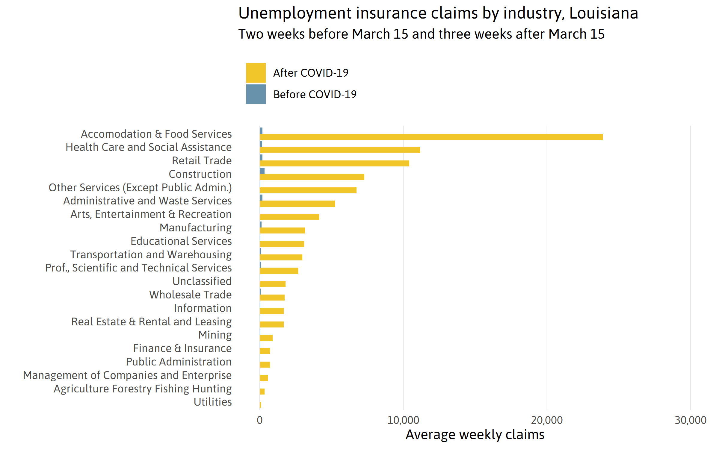 This webpage highlights data relevant to the effects of COVID-19 on the local economy. Indicators include initial unemployment claims for Louisiana and workers who might be at most immediate risk of job loss. While we won’t know the full effects of this unprecedented public health and economic crisis for some time, we will continue to publish indicators here about how our region’s workers and businesses might be affected to inform decisionmakers about the ripple effects of COVID-19 on our local economy.
