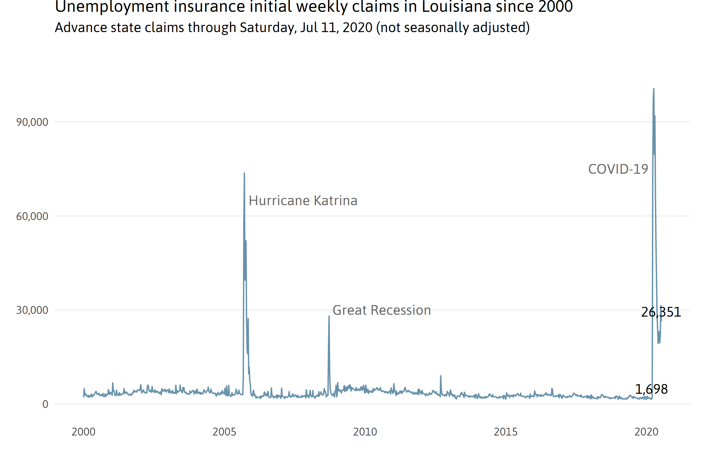 The COVID-19 crisis is causing unprecedented disruptions to the economy, both locally and nationally.1 We should learn more about the effects on our local economy over the coming months. In the meantime, initial unemployment insurance (UI) claims in Louisiana show how many newly unemployed workers have applied for benefits.2 Initial claims don’t reflect a comprehensive count of joblessness, but they do offer a nearly up-to-date gauge for how many individuals are experiencing separation from employment and then applying for benefits on a week-by-week basis.
