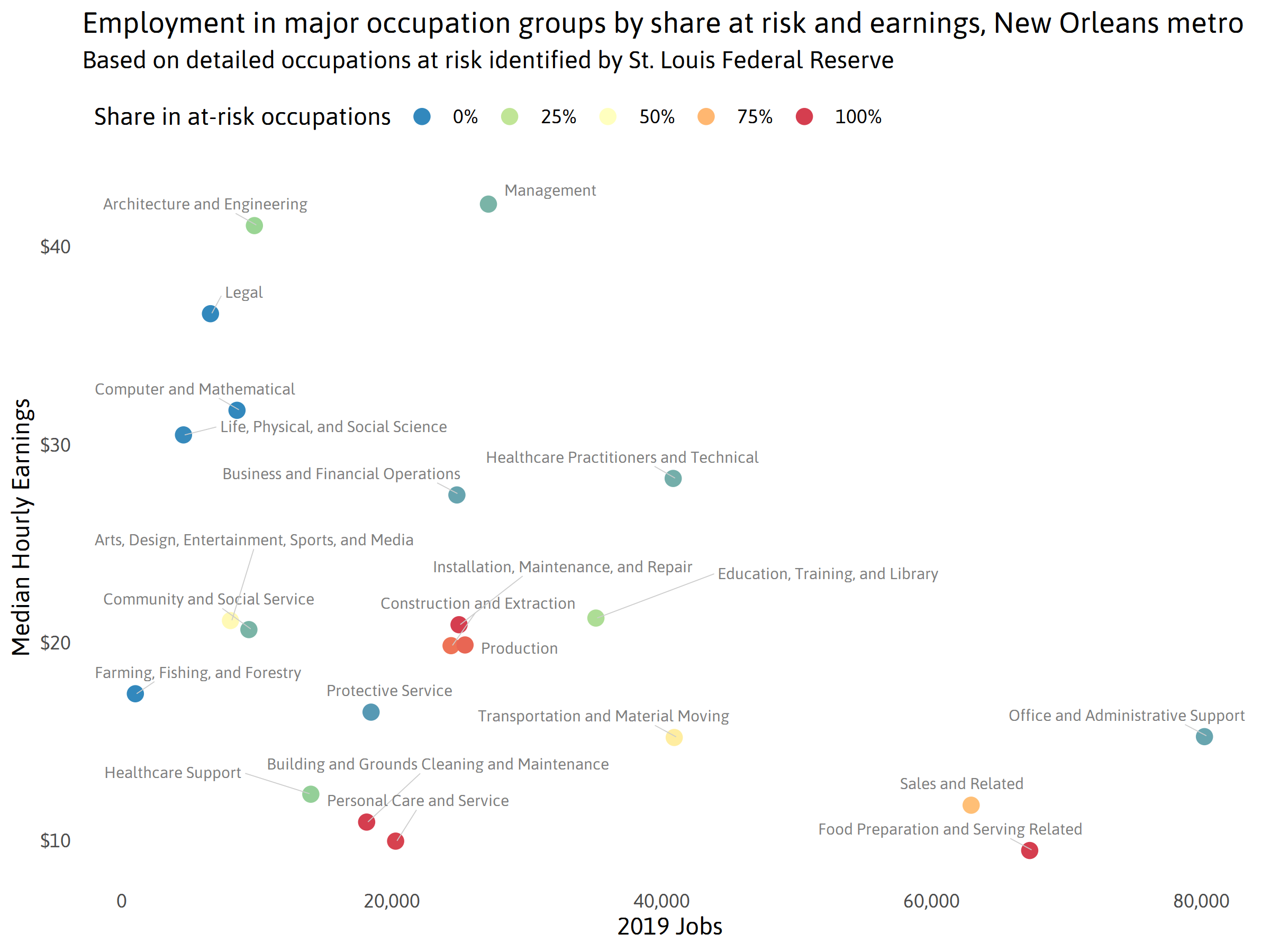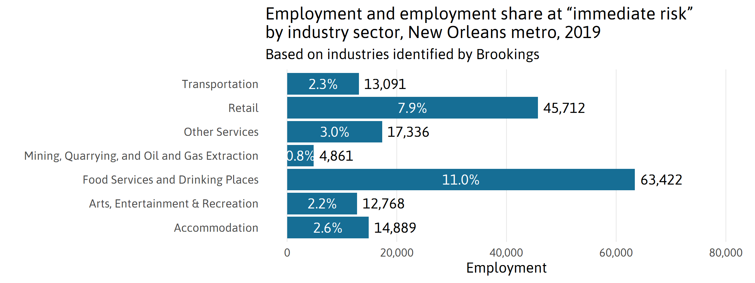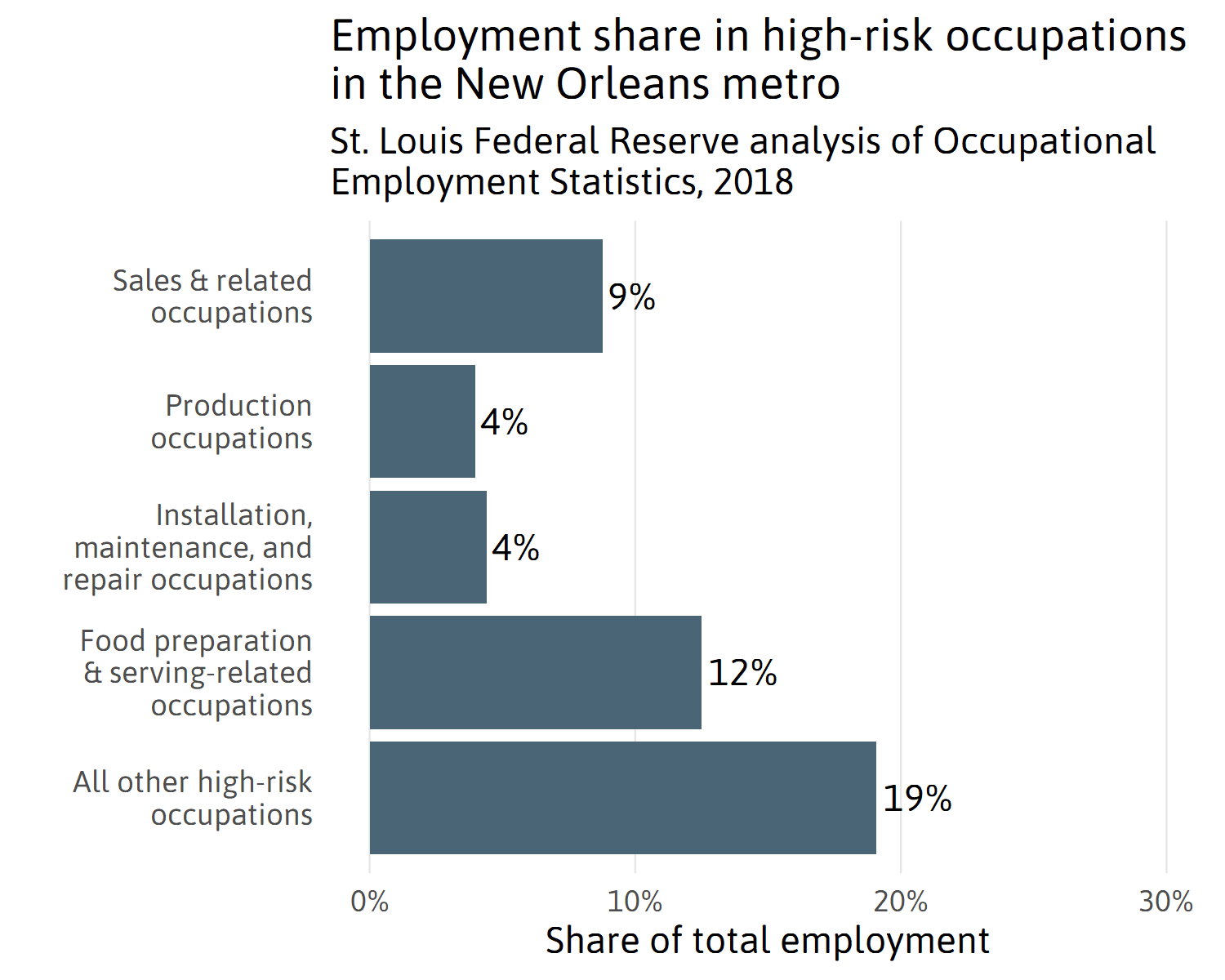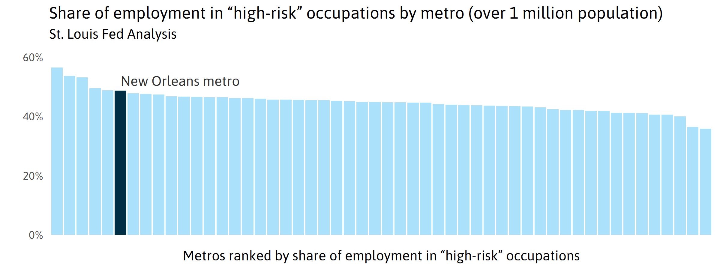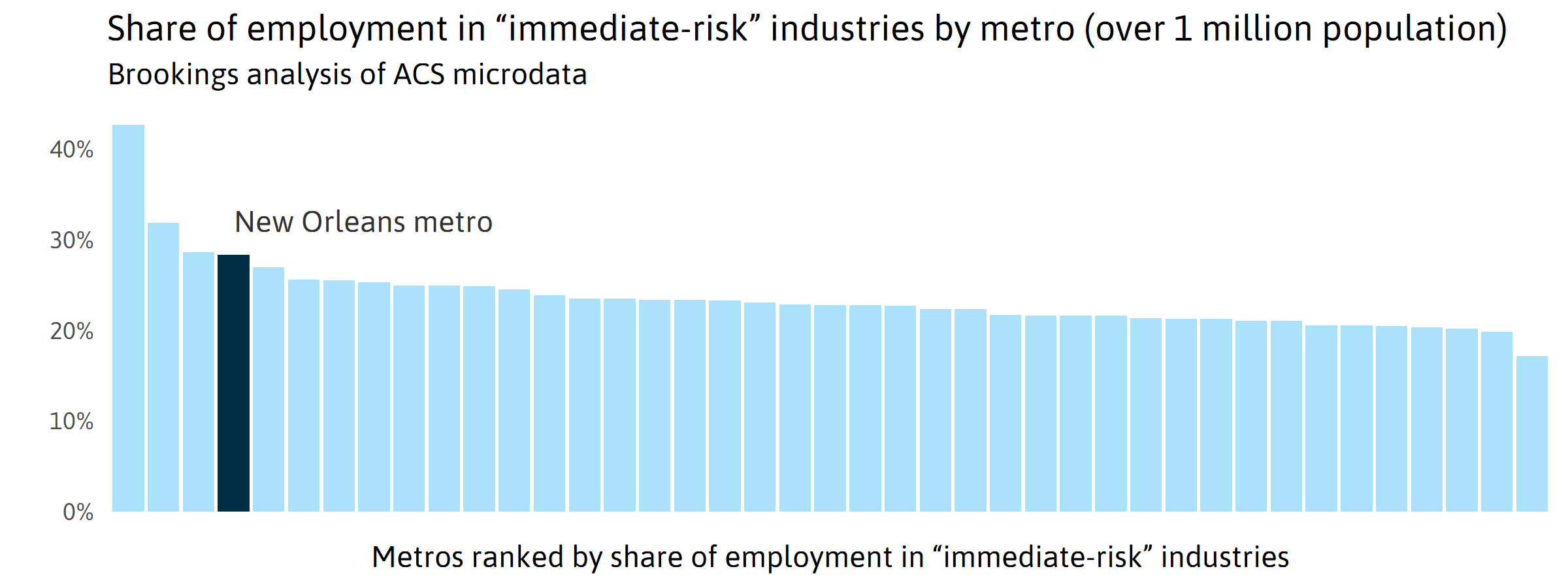 Echoing the finding of the industry-driven analysis published by Brookings, the share of employment in high-risk occupations in the New Orleans metro ranked near the top among large metros.