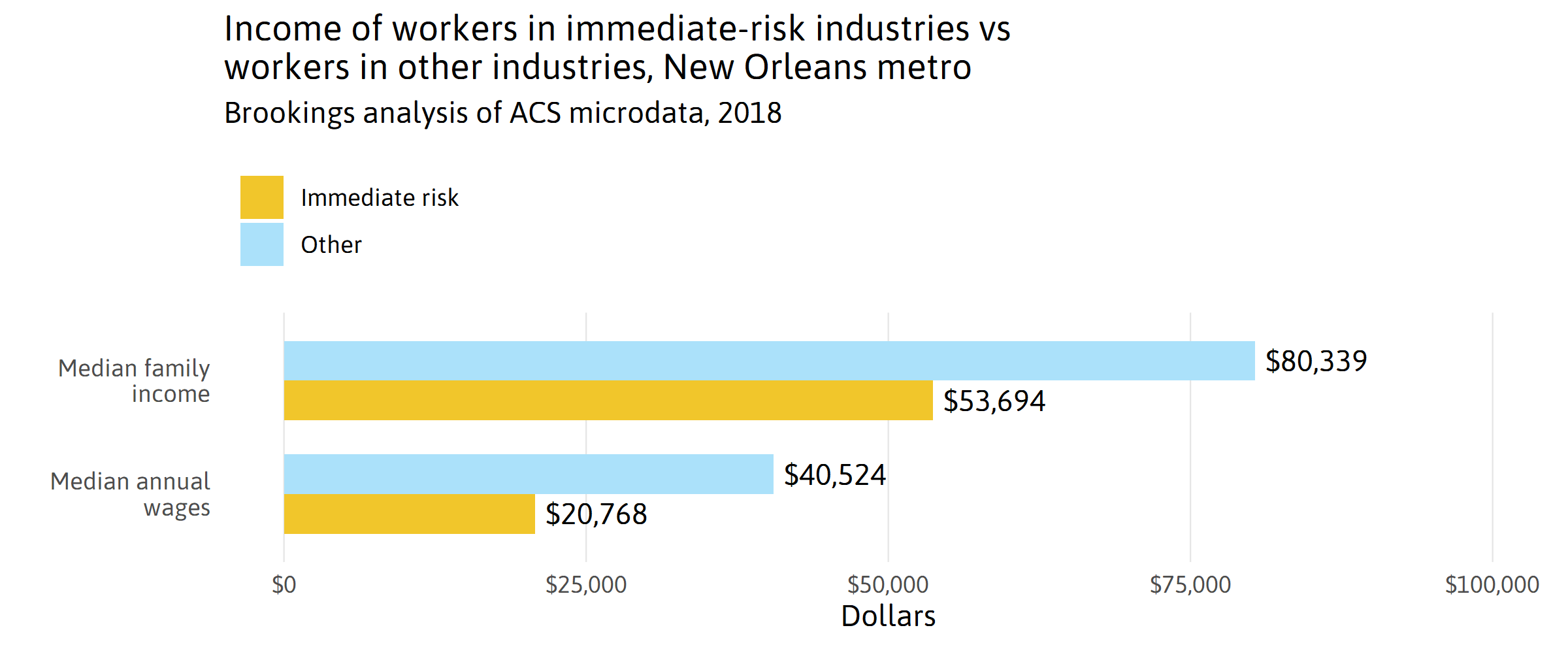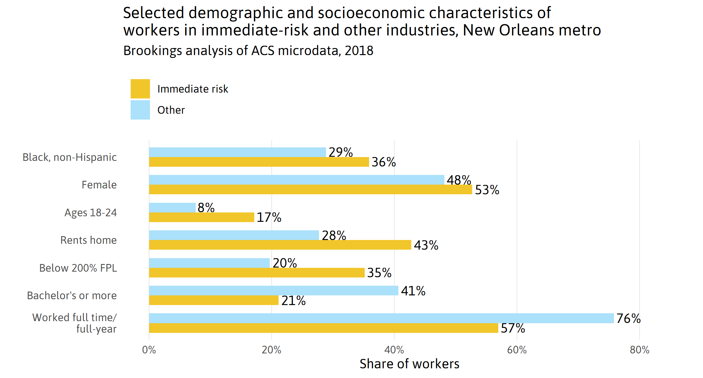 Speculative, back-of-the-envelope estimates suggest that the risk of job loss is distributed unevenly to lower-earning workers. The shock of job loss can acutely undermine the ability of families with limited liquid assets to afford basic expenses and debt payments, especially when experiencing prolonged unemployment.21 The estimates reported above expose how precarious finances and well-being could become for workers who may lose jobs and who likely already have lower earnings. The New Orleans metro’s relatively large share of at-risk industries and occupations also points to the potential ripple effects on the regional economy of a prolonged contraction of spending by unemployed workers. During the public health fight against COVID-19, a major benchmark for economic policy responses will be to maintain the well-being of displaced workers. The employer payroll, unemployment insurance, and direct relief payment provisions of the CARES Act should alleviate some of the current and impending hardships, but further steps at the state and local level might be necessary, both as a short-term “bridge,” where support is late or insufficient, and in the longer-term transition to more resilient employment opportunities for vulnerable workers.22