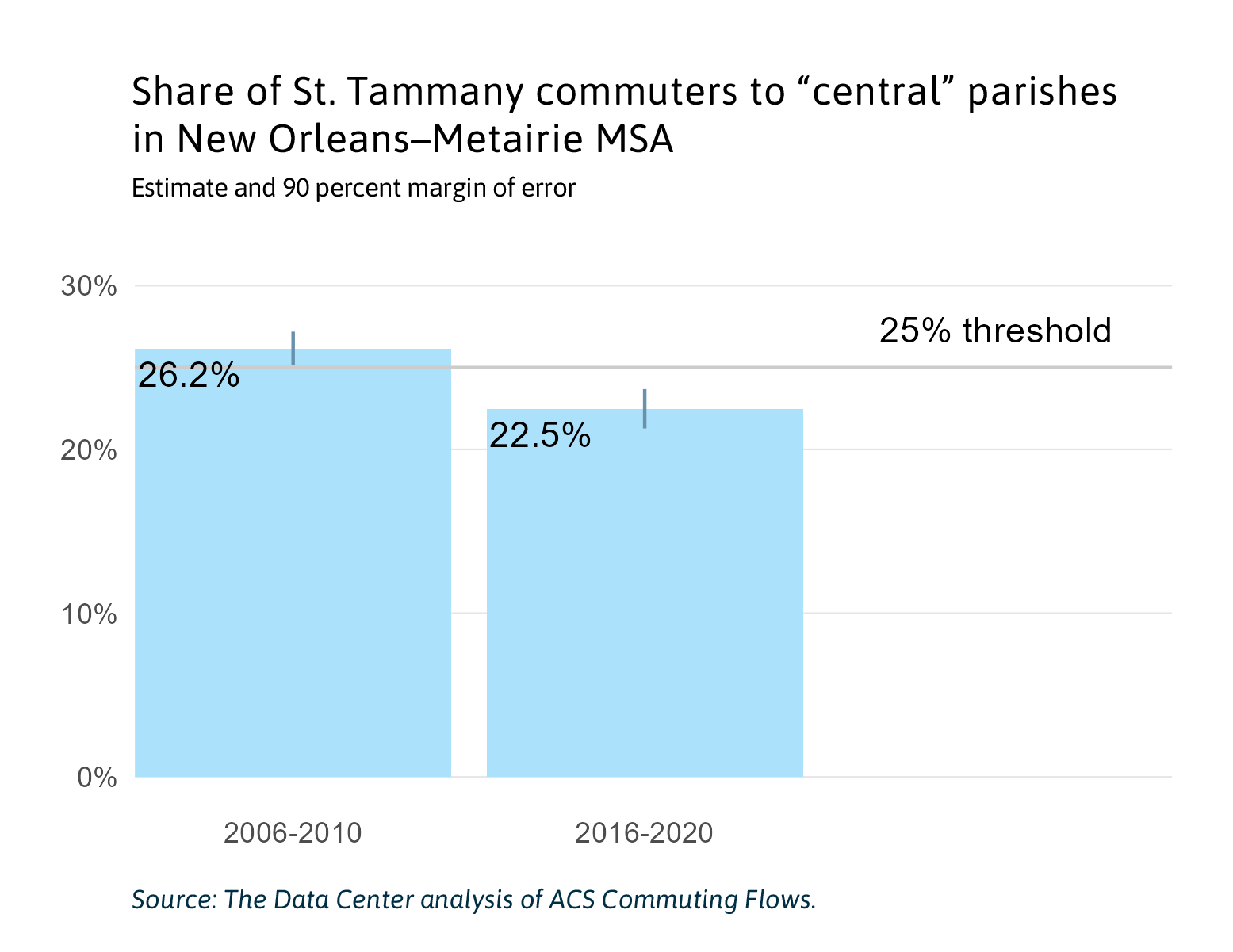 Orleans Parish and New Orleans are interchangeable. Their boundaries are the same, and they contain the same population. In 2023, the official definition of the New Orleans metro area changed to exclude St. Tammany, because a smaller portion of workers who live in St. Tammany are commuting to work in Orleans, Jefferson, and other parishes on the south shore of Lake Pontchartrain. To learn more about how metro areas are defined and how this change came about read this Research Note.