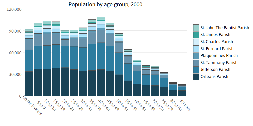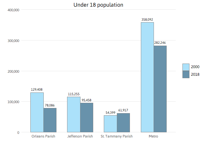 While the metro has regained much of the post-Katrina population losses, youth population is substantially lower than pre-Katrina levels. The metro had 358,092 children under 18 years in 2000 and only 282,246 in 2018. Much of this loss was driven by Orleans Parish, where the under 18 population declined to 78,086 from 129,408. The under 18 population is now 22 percent of the metro population, down from 27 percent in 2000.
