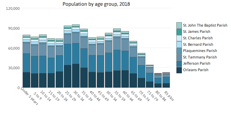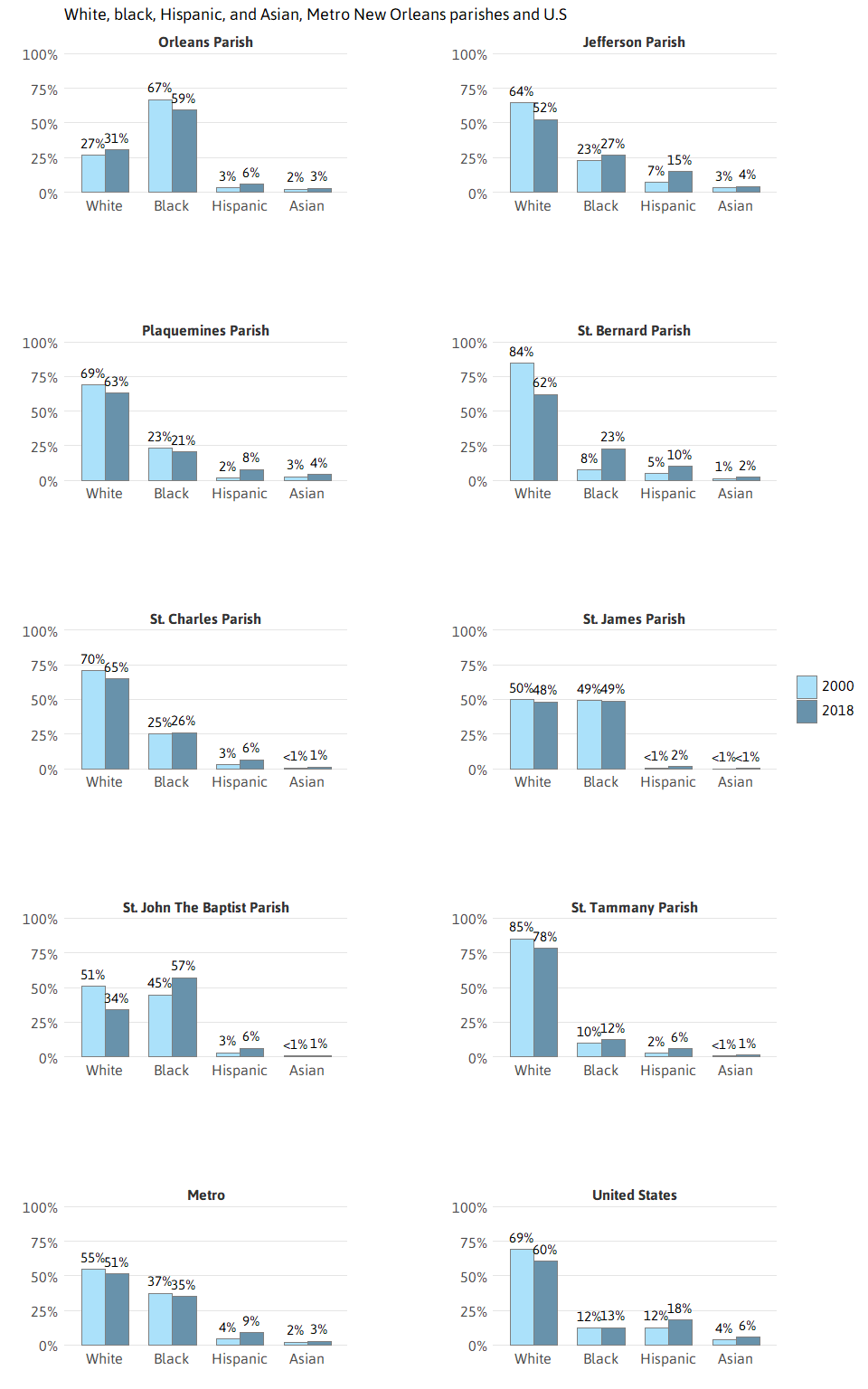 The U.S. Census Bureau estimates that 1,270,399 residents were living in metro New Orleans as of July 2018, a 7 percent increase from April 2010.[1] The metro area now has 95 percent of its 2000 population of 1,337,726. In this brief, we examine demographic data released by the U.S. Census Bureau and identify important changes in metro area parishes since 2000 (or the best benchmark available).