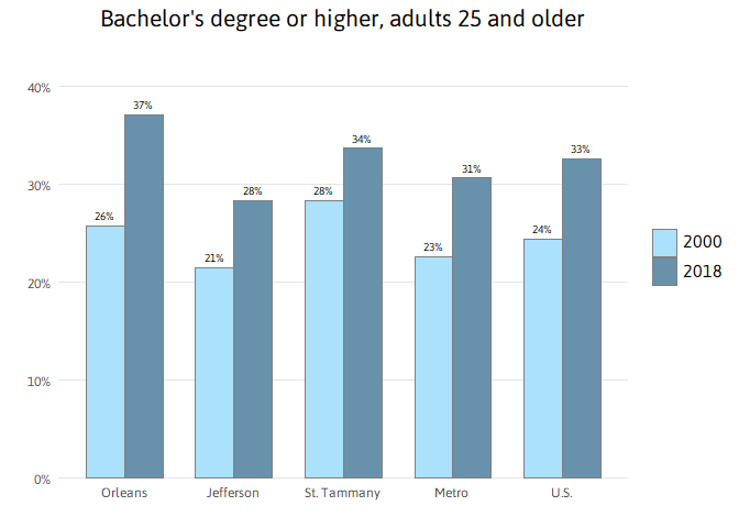 The metro area decline in the share of adults with less than a high school degree has been coupled with an increase in the share with a bachelor’s degree or higher. In New Orleans, 37 percent of adults 25 and older had a college degree in 2018 — higher than the U.S. average of 33 percent, and up from 26 percent in 2000. The overall metro area share of adults with a bachelor’s degree grew from 23 to 31 percent — lower than the national average.