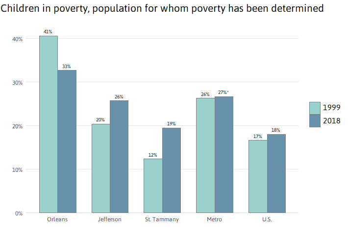 Like the overall poverty rate, the child poverty rate in New Orleans decreased between 1999 and 2018. In Jefferson Parish, the child poverty rate jumped from 20 percent in 1999 to 26 percent in 2018 — greatly surpassing the U.S. child poverty rate, which rose from 17 to 18 percent between 1999 and 2018.