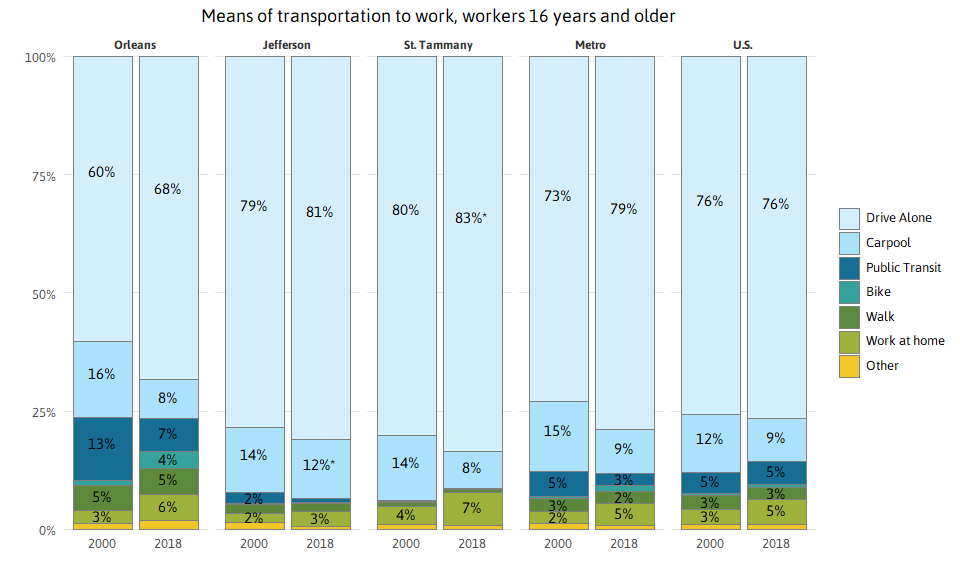 The percentage of workers who commute by driving alone has increased within the metro region since 2000 from 73 percent to 79 percent, driven by a 60 to 68 percent rise in Orleans Parish. This goes against the national trend, where the share driving alone remained steady between 2000 and 2018 and where public transit use has also remained steady.