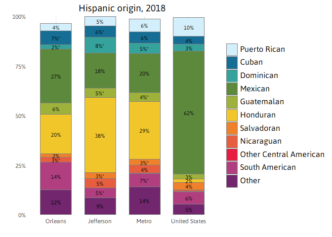 Hispanic is an umbrella term comprising multiple nationalities and ethnicities. Researchers have shown that most Hispanics prefer to identify by nationality rather than by pan-ethnic terms such as “Hispanic” and “Latino.”[3] The nationalities of Hispanics residing in metro New Orleans is quite distinct from the national Hispanic profile.