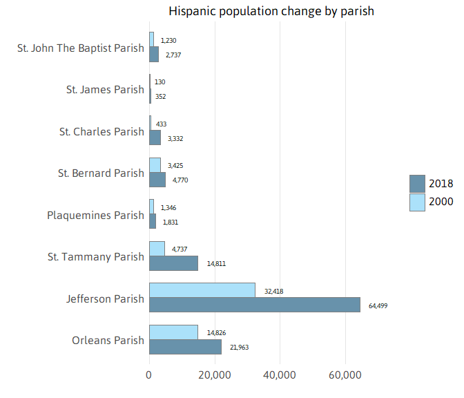 Between 2000 and 2018, the number of Hispanics in Jefferson Parish increased by 61,074 reaching over 15 percent of the total parish population. Orleans Parish and St. Tammany Parish gained 7,137 and 14,681 Hispanics, respectively, such that the Hispanic share of the population was 6 percent in Orleans and 6 percent in St. Tammany in 2018.