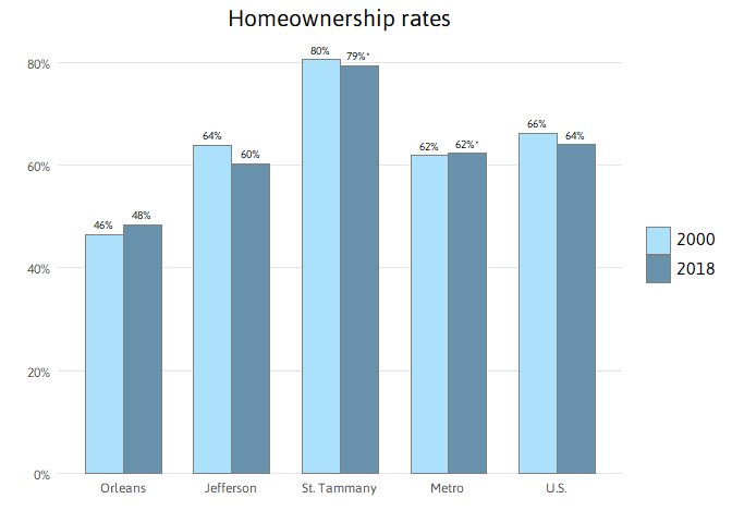 Homeownership rates across the U.S. have fallen since 2000 from 66 to 64 percent in 2018. Homeownership rates have held steady in St. Tammany around 80 percent since 2000. In contrast, homeownership rates in New Orleans have increased slightly, but still are a much lower 48 percent.