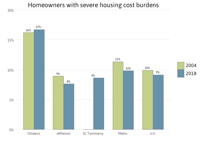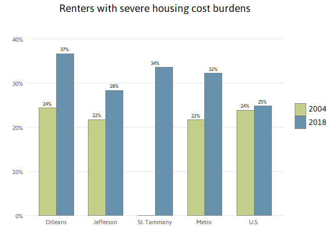 High housing costs can limit a region’s ability to attract and retain the workforce essential for a healthy economy.[11] Severe housing cost burdens of more than 50 percent of household income indicate a serious problem in housing affordability. In 2004, the share of severely cost-burdened renters in New Orleans and the U.S. was 24 percent. In the 14 years since, that share has spiked to 37 percent in Orleans while rising to only 25 percent nationally. In Jefferson Parish, the share of renters paying more than 50 percent of household income on housing and utilities is 28 percent in 2018.