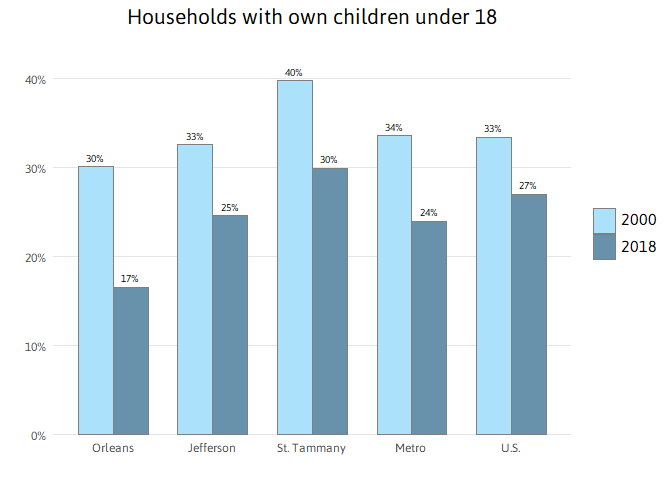 Meanwhile, the share of households with children is shrinking while the share of individuals living alone is growing — both across the metro and nation. As of 2018, 24 percent of households in metro New Orleans included children, down from 34 percent in 2000. Between 2000 and 2018, the percent of St. Tammany households with children declined from 40 percent to 30 percent; the percent of Jefferson households with children declined from 33 percent to 25 percent; and the percent of Orleans households with children declined from 30 percent to 17 percent.