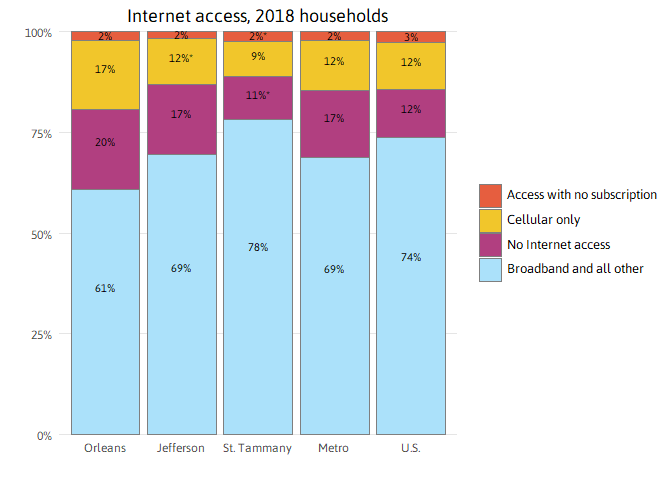 Internet access is an important indicator of access to information. Studies have shown that without broadband, computer access, and encompassing technology training services, workers and students are at a disadvantage in the job market and education system.[6] Only 61 percent of households in Orleans Parish and only 69 percent of households in Jefferson Parish are connected to the Internet through a home-based internet service, such as broadband (cable, DSL, or fiber), satellite, or dial-up service, compared to 74 percent nationwide. St. Tammany is above the national average at 78 percent of households connected to the Internet by a home-based service internet connection. Internet access without a subscription refers to households who only have access through group access locations such as school, work, a library, or coffee shop.