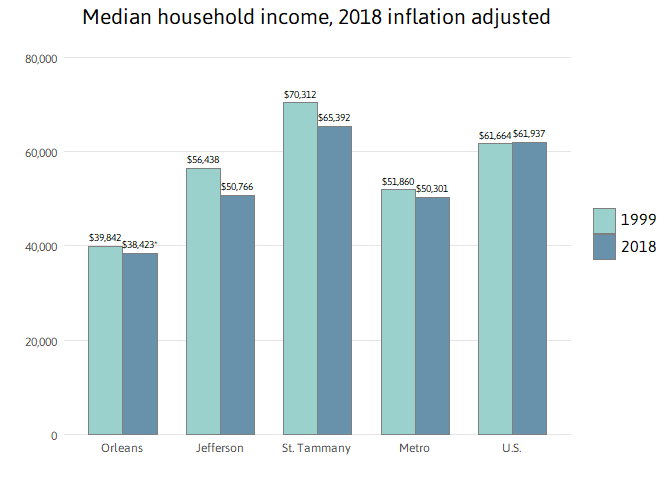 The 2018 median household income of $50,301 for the metro, $50,766 for Jefferson Parish, and $38,423 for the city are significantly lower than the U.S. median of $61,937. In Jefferson Parish, median household income declined 10 percent between 1999 and 2018, even after adjusting for inflation, falling to $50,766.