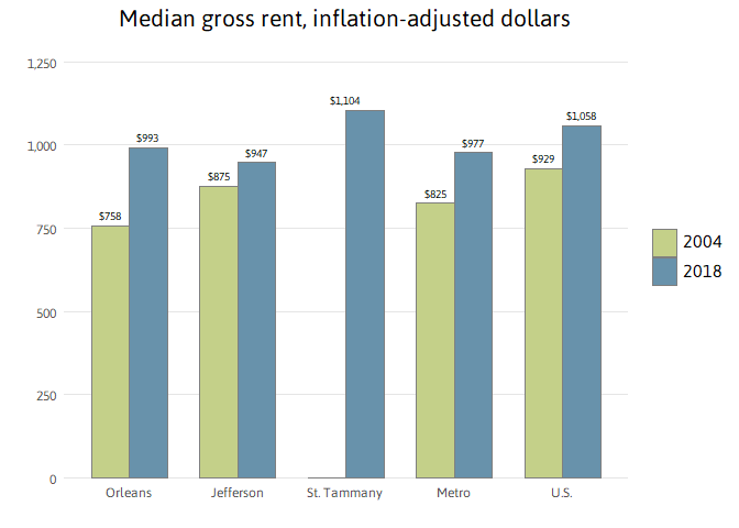 The surge in the share of severely cost-burdened renters in New Orleans is reflective of the surge in the median gross rent (rent plus utilities) in the city. From 2004 to 2018, monthly rent plus utilities rose from $758 to $993 in New Orleans, a 31 percent increase after adjusting for inflation. Meanwhile, median gross rents increased 18 percent metrowide compared to only 14 percent nationwide.