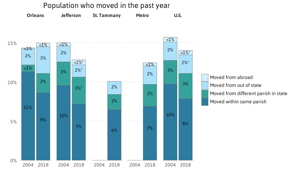 Notes: Share not included in the bar chart represents the population who lived in the same house one year ago (non-movers). For people living in the same house as a year ago, the difference between 2004 and 2018 is not significant at the 95% confidence interval for Jefferson. It is significant for all other geographies