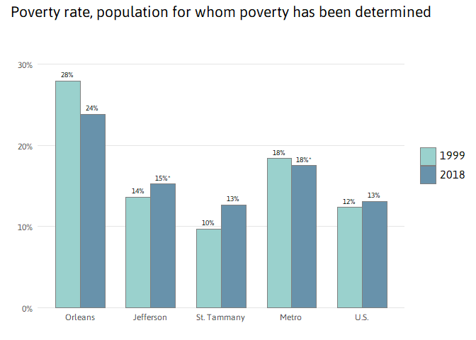 Individuals living below the poverty level indicate the economy is not providing all residents with the ability to meet their most basic needs, including food, housing, and transportation. The poverty rate in New Orleans decreased from 28 to 24 percent between 1999 and 2018 while the Jefferson Parish poverty rate remained statistically unchanged. Across the U.S., the poverty rate increased from 12 to 13 percent between 1999 and 2018.