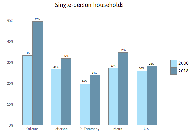 As households with children have declined, the share of single-person households has grown in the metro and nationwide. The metro area share of individuals living alone grew from 27 percent in 2000 to 35 percent in 2018 — similar to the trend for Jefferson Parish where the share of households living alone grew from 27 percent to 32 percent. The increase was larger in Orleans Parish, which jumped from 33 to 49 percent.