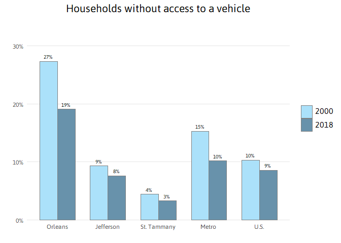 Post-Katrina, the share of New Orleans households without access to a vehicle dropped from 27 percent in 2000 to 19 percent in 2018. Nonetheless, at 19 percent, New Orleans’ share is more than twice as high as in neighboring parishes and the nation, indicating the importance of a robust public transportation system and comprehensive evacuation plan.