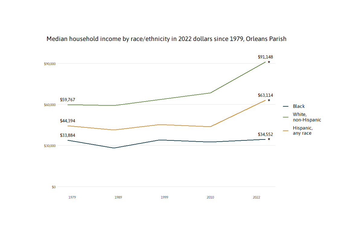 In 1979, households with higher incomes were disproportionately in the parishes surrounding New Orleans, while lower income White, Hispanic, and Black households were more likely to live in the city.6 By 2024, these patterns had changed with higher income White households more often living in the city, such that income disparity within the city has escalated. In 2024, Black households in New Orleans had a median income of only $40,285, while Hispanic households were at $63,594, and White households at $90,322.