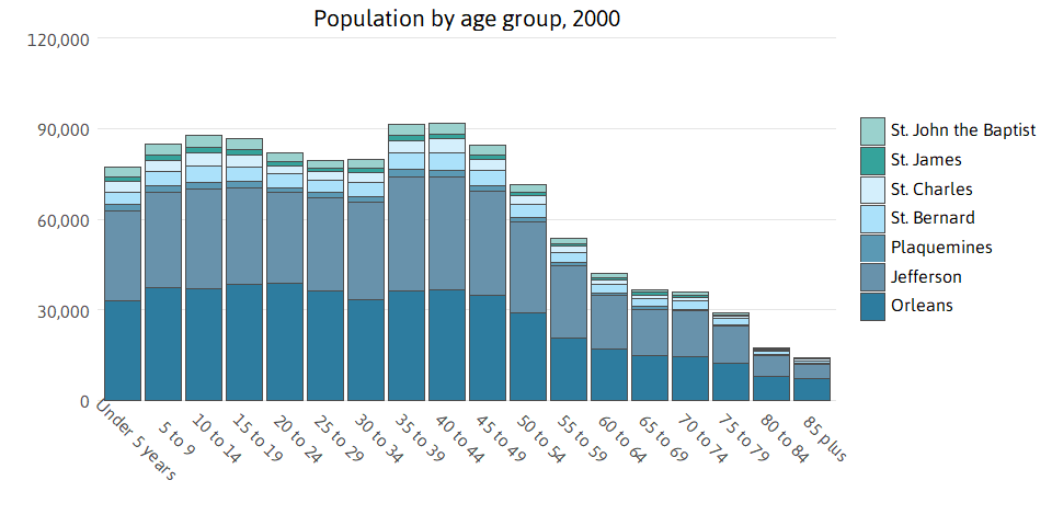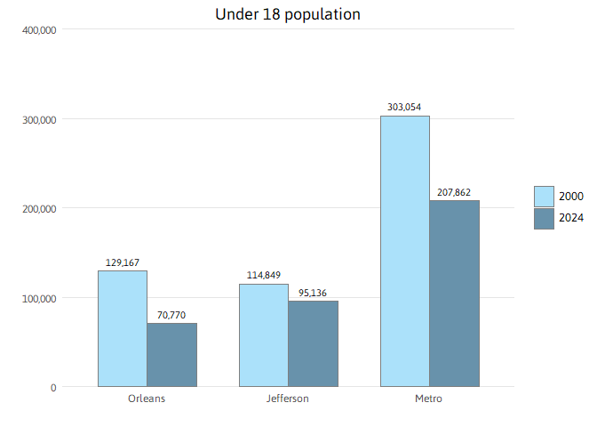 Overall, the youth population is substantially lower than pre-Katrina levels. The metro had 303,054 children under 18 years in 2000 and only 207,862 in 2024. More than half of this loss was driven by Orleans Parish, where the population under 18 has declined to 70,770 from 129,167. Jefferson Parish’s child population also declined from 114,849 to 95,136. The under 18 population is now 22 percent of the metro population, down from 26 percent in 2000.