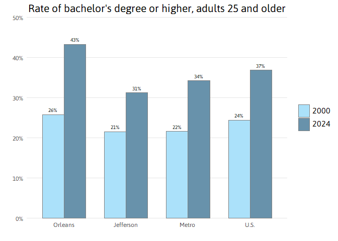 Educational attainment is an important determinant of household incomes, workforce skills, and regional resiliency.5 In New Orleans, 43 percent of adults 25 and older had at least a bachelor’s degree in 2024 — higher than the U.S. average of 37 percent, and up from 26 percent in 2000. The Jefferson Parish share of adults with a bachelor’s degree is 31 percent up from 21 percent in 2000. Overall, the share of adults with a bachelor’s degree in Metro New Orleans from 22 to 34 percent — just short of the national average of 37 percent.
