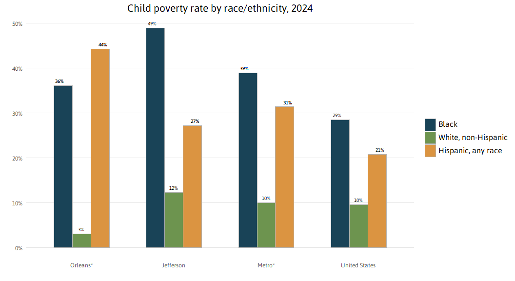 While in Orleans, poverty rates for Black children are 10 times higher than for White children, in Jefferson Parish Black children experience poverty about four times higher rates than White children. In Metro New Orleans, 31 percent of Hispanic children live in poverty — higher than their national peers of whom 21 percent live in poverty.