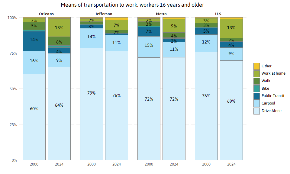A metro region is partially defined by the commuting patterns of its residents. Nationwide and across Metro New Orleans, there has been a sizable increase in people working from home since the COVID-19 pandemic struck. In New Orleans, the share working at home rose from 3 percent in 2000 to 13 percent in 2024, while the share using public transportation declined sharply from 14 percent in 2000 to 4 percent in 2024. Working from home is somewhat less common in Jefferson (7 percent) than in New Orleans or across the nation (13 percent).