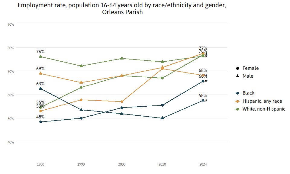 In 2024 New Orleans, White men (at 76 percent) are more likely to have employment than their national peers, while Black men and women in New Orleans (at 58 and 66 percent respectively) are less likely to have employment than their national peers. The rates of employment for White women, Hispanic men and women are not statistically different than their national peers.