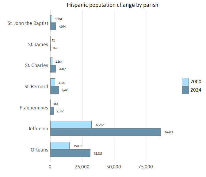 Between 2000 and 2024, the number of Hispanics in Jefferson Parish more than doubled — reaching 86,663 or more than 20 percent of the total parish population. In Orleans and St. Bernard parishes, the Hispanic population nearly doubled — growing to 31,213 (9 percent of the population) in Orleans and 6,421 (14 percent of the population) in St. Bernard. The number of Hispanics in St. Charles, St. John the Baptist, Plaquemines, and St. James more than doubled reaching 4,417, 4,074, 2,322, and 407 respectively.