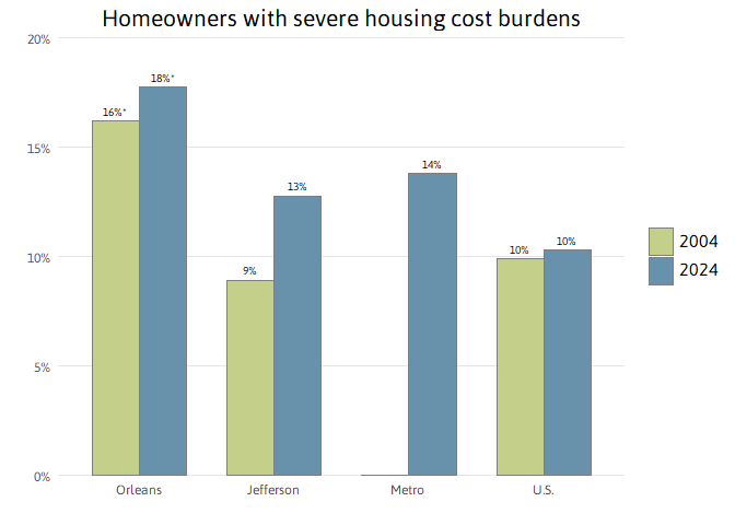 Homeownership rates across the U.S. have fallen since 2000 from 66 to 65 percent in 2024. Homeownership rates in New Orleans have increased from 46 percent in 2000 to 53 percent in 2024, but remain lower than the metro as a whole where 62 percent of households are homeowners.