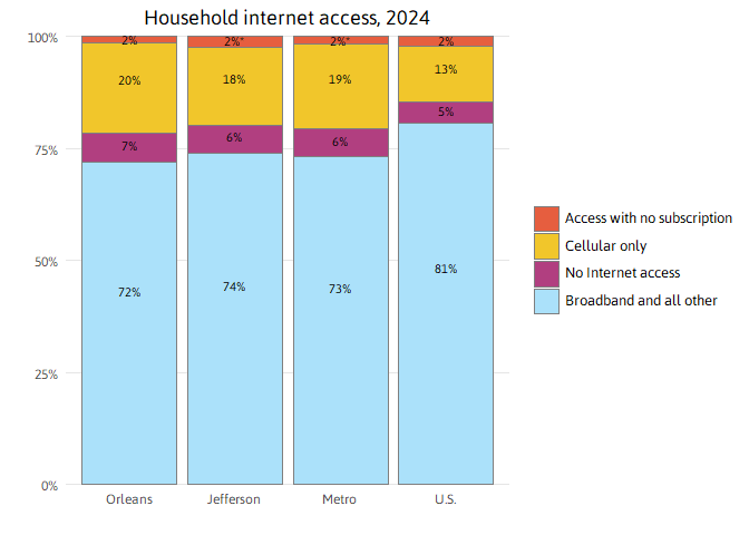 An increasingly common way to access the internet is through a smartphone or some other cellular device. While, in general, smartphone access contributes positively to lessening the Digital Divide, having access only through a smartphone restricts ability to fully leverage the internet to complete common tasks such as writing and researching a resume, registering your kids for school, analyzing data about your neighborhood, or creating content for an internet business. In Orleans Parish, 20 percent of households only have access through a smartphone, compared to 13 percent nationwide.