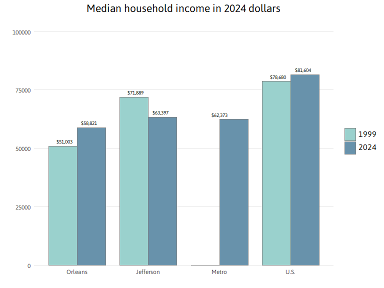 The 2024 median household income in Orleans Parish is $58,821 — 13 percent higher than in 2000 after controlling for inflation. Meanwhile, the median household income in Jefferson Parish, at $63,397 is 12 percent lower than in 2000 after controlling for inflation. The 2024 Metro New Orleans median household income of $62,373, $63,397 for Jefferson Parish, and $58,821 for the city of New Orleans are significantly lower than the U.S. median of $81,604.