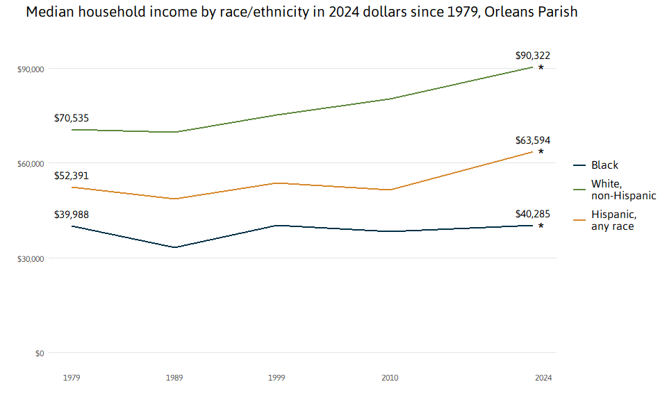 In 1979, households with higher incomes were disproportionately in the parishes surrounding New Orleans, while lower income White, Hispanic, and Black households were more likely to live in the city.6 By 2024, these patterns had changed with higher income White households more often living in the city, such that income disparity within the city has escalated. In 2024, Black households in New Orleans had a median income of only $40,285, while Hispanic households were at $63,594, and White households at $90,322.