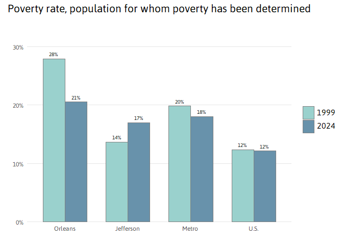 Like the overall poverty rate, the child poverty rate in New Orleans decreased from 41 percent 1999 to 29 percent in 2024. In Jefferson, 26 percent of children live in poverty and across the metro 26 percent, both higher than the national rate.