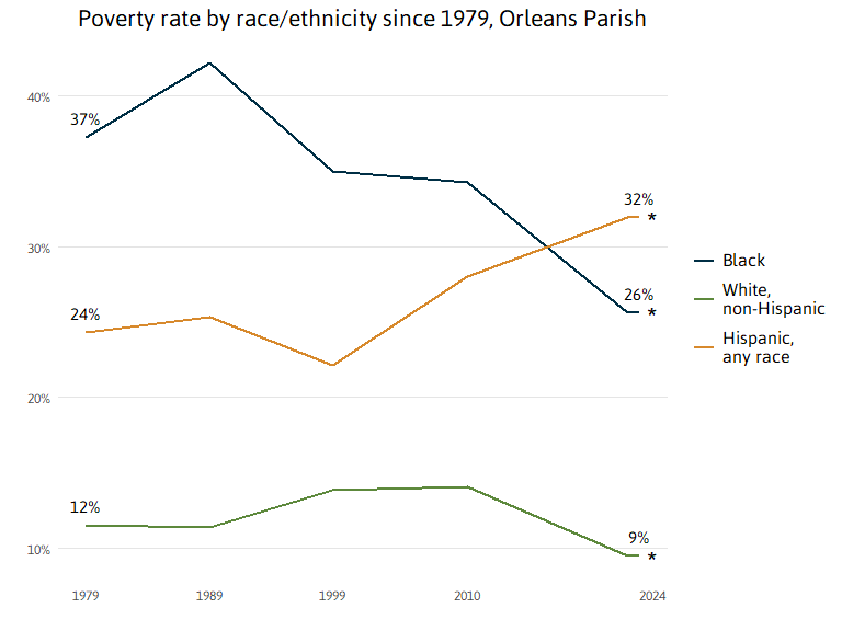 The poverty rate for Black New Orleanians spiked when the 1980s “oil bust” hit, jumping from 37 percent in 1979 to 42 percent in 1989. White New Orleanians were not similarly affected. The poverty rate for White New Orleanians remained at roughly 12 percent in 1979 and in 1989. In 2024, the poverty rate for White New Orleanians was 9 percent, while the poverty rate for Black New Orleanians had fallen to 26 percent but remained about triple that of White New Orleanians.