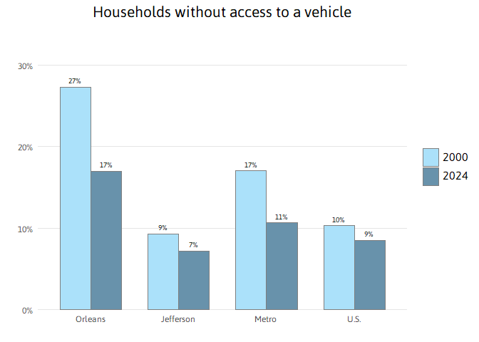 Post-Katrina, the share of New Orleans households without access to a vehicle dropped from 27 percent in 2000 to 17 percent in 2024. Nonetheless, at 17 percent, New Orleans’ share is higher than the metro overall, indicating the importance of a robust public transportation system and comprehensive evacuation plan.