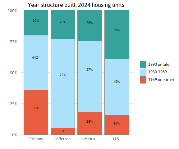 In Orleans Parish, fully 36 percent of all housing units are in pre-1950 structures. Meanwhile, in Jefferson Parish, 72 percent of the housing stock was built in the 1950s, 1960s, 1970s, and 1980s, and just 23 percent of housing stock has been built since 1990.