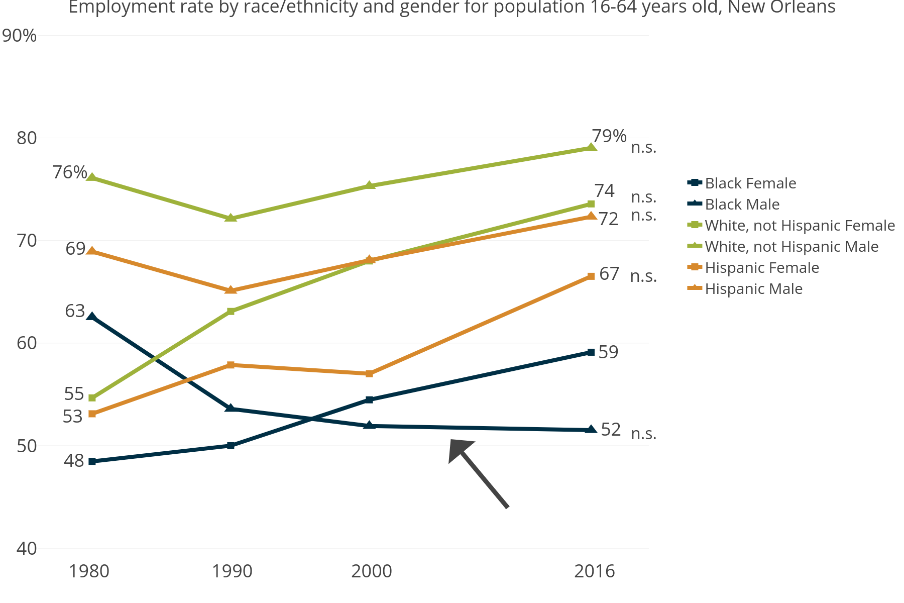 2) Employment rates for all demographics have risen since 1990, except for black men.