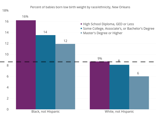 4) Though more education is generally associated with a decreased risk of having a baby born with low birth weight, black mothers with a Master’s degree or higher had a greater likelihood of having a low birth weight baby than white mothers with a high school degree or less.
