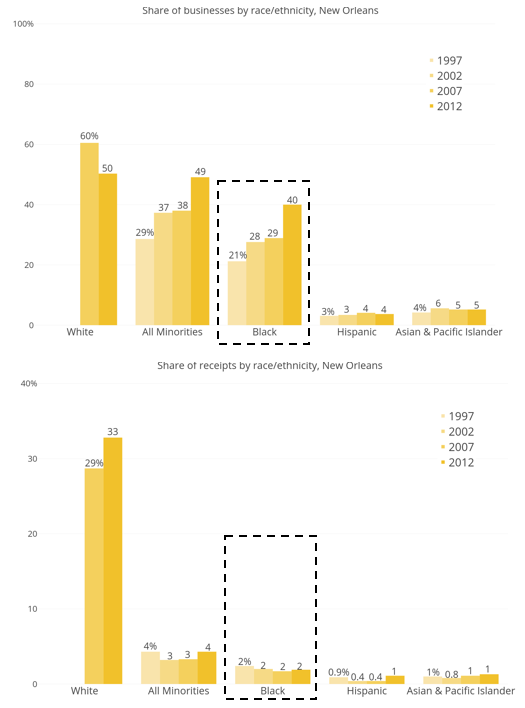 3) From 1997 to 2012, the percentage of black owned business in New Orleans nearly doubled, but the total share of receipts going to those businesses has remained stagnant at roughly 2% over that same time frame.