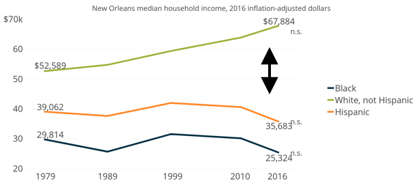 1) Racial disparity in household income has increased since 1979 with inflation adjusted household income for families of color actually decreasing over time.