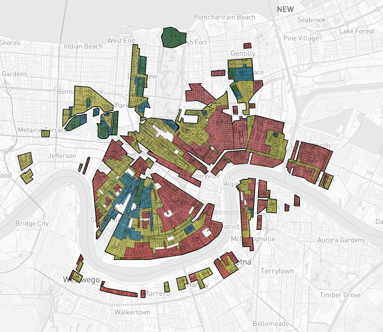 Discriminatory real estate practices and policies fundamentally reshaped cities across the United States during the 20th century. “White flight” and racialized federal subsidy drove the process of rapid suburban growth. Investment flocked to newly developed sections of the city of New Orleans and suburban parishes while highway construction, public housing, and “redlining” steered investment away from poor and black neighborhoods. The unmistakable correspondence between redlining maps from the 1930s and the map of life expectancy today highlights continuities with the policies implemented during middle decades of the 20th century.