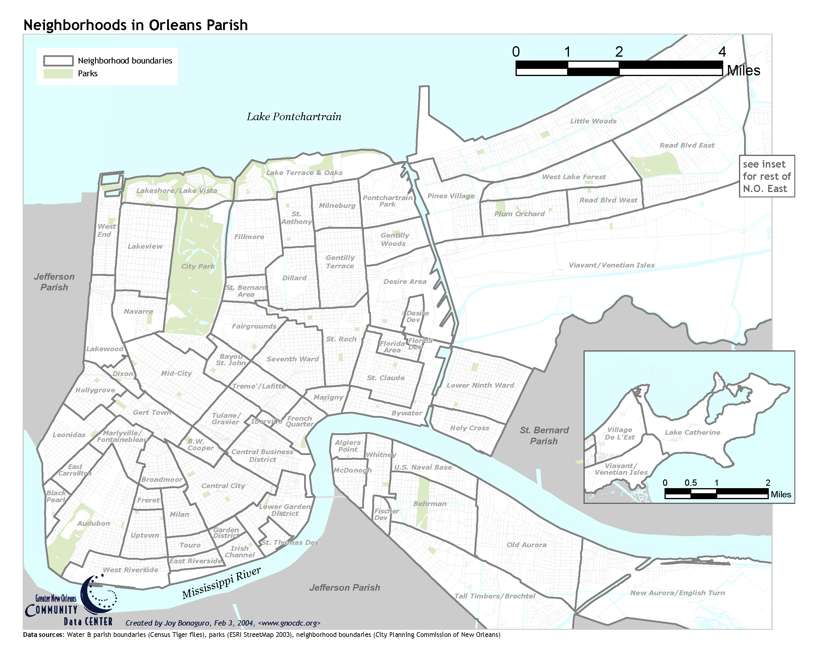 The Data Center’s neighborhood statistical areas are originally based on City Planning Commission boundaries from the city of New Orleans, first designated in the 1980s. While these definitions have practical advantages for compiling data, both the concept of a neighborhood and the specific boundaries of neighborhoods are subject to many interpretations. Additional background can be found in a note on The Data Center website. A reference map of these neighborhoods is available in figure 3.6 and in the reference maps section of The Data Center website.