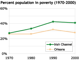 1990sBy 1990 the poverty rate in the Irish Channel had reached 43% (higher than the rate of 32% in Orleans as a whole). On this data, Mr. Tatian observes that while the Irish Channel was apparently not an affluent neighborhood before, it crossed into what we consider the extreme poverty range (over 40% poor) between 1980 and 1990.