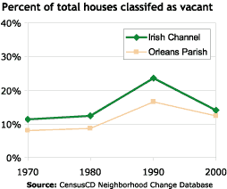 In 1990, 1 in 4 Irish Channel houses was vacant. By the late 1990s, things were turning around in the neighborhood. Ms. Husing points out that change has been happening with incredible speed. The houses that werent torn down are being purchased and renovated. And the people who own section 8 rentals are doing renovations for higher-paying tenants. My neighbors, little old Black ladies, are saying Used to be I couldnt give my house away. I cant believe how much its worth now!