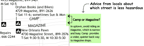 For example, anyone who's been in uptown New Orleans for any amount of time knows that Magazine Street isn't the best place to be safely riding a bike. The narrow, curving street is lined with busy shops and on-street parallel parking. Camp Street, though, one block lakeside, is wider and residential.