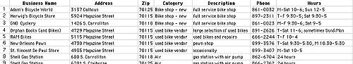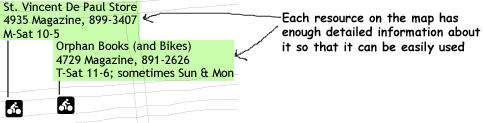 So the students on the bicycle planning team talked to area cyclists about where they go for resources and cycled around uptown to add to the data from the Yellow Pages. They gathered the information they thought a student would need to be able to use each resource (location, phone number, hours of operation, etc.).
