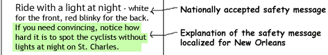 The planning team wrote the text on the map to acknowledge the challenges of bike riding in New Orleans, and offer concrete tips on how to adapt to these challenges.